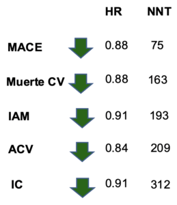 - Confirma el beneficio de los arGLP-1 sobre los eventos cardiovasculares en una amplia población de pacientes con DM2. Si bien se observa una reducción tanto en muerte cardiovascular, ACV y IAM, el impacto parece ser mayor sobre el ACV.