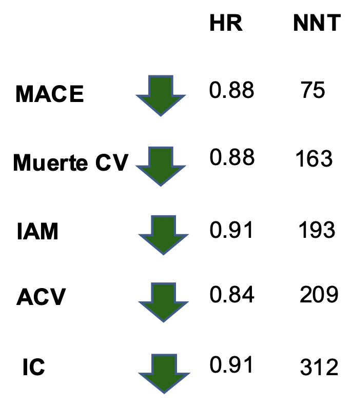 - El beneficio de los arGLP-1 se observó en pacientes con diferente A1C basal, y tanto en pacientes con eventos CV previos como en prevención primaria. Por supuesto, el impacto clínico es mayor en aquellos con mayor riesgo basal.