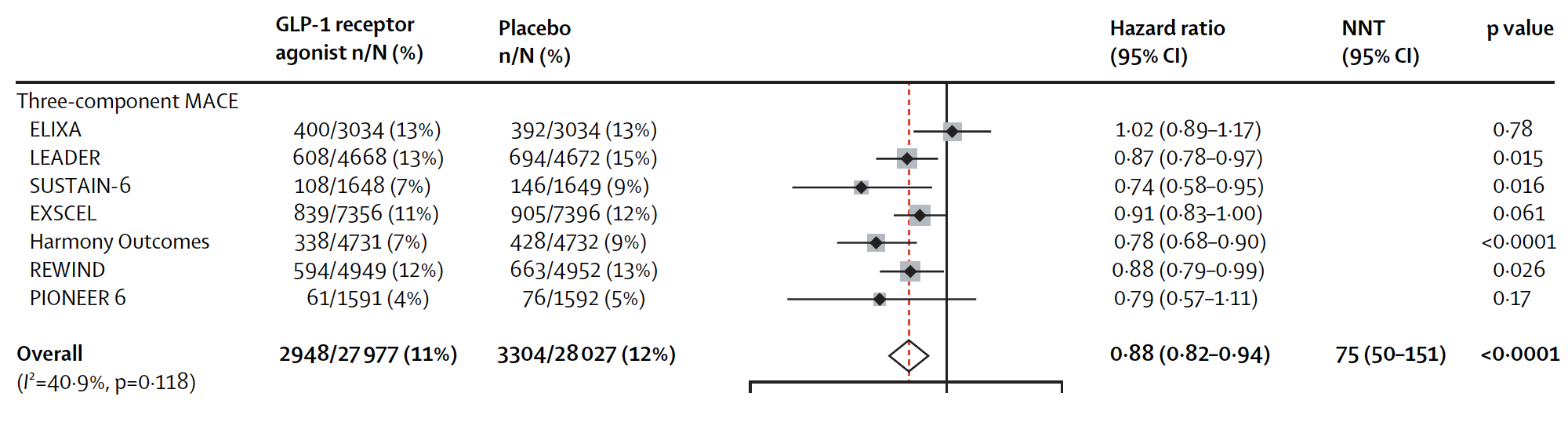 La revisión incluyó 56.004 pacientes de 7 ECR. La edad media varió entre 60 a 66 años y el 76,58 % de los pacientes presentaban antecedentes de enfermedad cardiovascular. Con una media de seguimiento de 3,2 años, el tratamiento con arGLP-1 se asoció con una reducción de riesgo para MACE del 12% (HR 0,88; IC 95%: 0,82-0,94; p<0,0001). El número necesario a tratar (NNT) para evitar un evento vascular mayor fue de 75.
